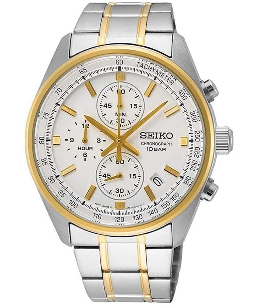 در بخش مشخصات فنی، این ساعت به مکانیزم کوارتز Seiko با کالیبر 8T67 مجهز است که دقتی معادل ±15 ثانیه در ماه را ارائه میدهد و عمر باتری آن حدود 3 سال است. ابعاد قاب این ساعت 41.5 میلیمتر قطر، 12.1 میلیمتر ضخامت و 46.5 میلیمتر فاصله بین لugs دارد. ساعت دارای صفحه سفید با عقربههای طلایی و نقرهای است و از شیشه Hardlex مقاوم در برابر خش بهره میبرد. بند استیل ضدزنگ آن با طراحی دو رنگ، ظاهری جذاب و مقاوم دارد.