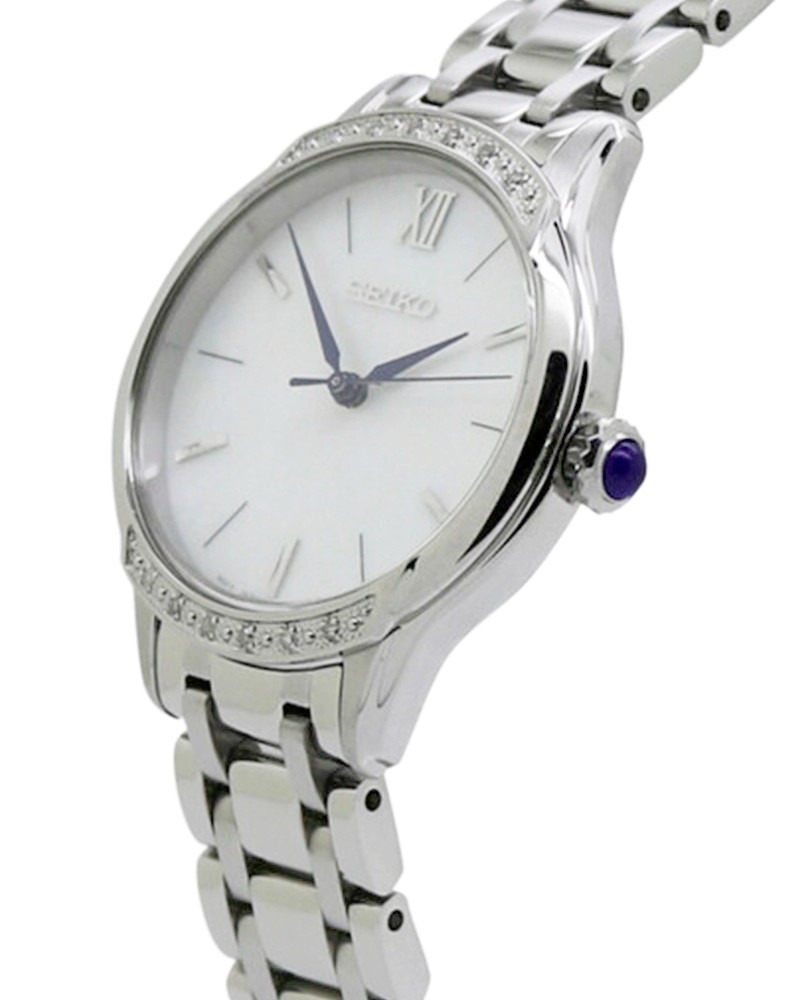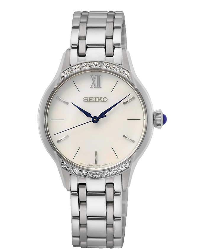 طراحی ظاهری SRZ543P1 شامل قاب استیل ضدزنگ با قطر 29.5 میلیمتر و ضخامت 6.3 میلیمتر است که آن را به گزینهای مناسب برای دستهای ظریف تبدیل میکند. صفحه ساعت از جنس مروارید طبیعی با رنگ سفید صدفی است که زیبایی خاصی به آن میبخشد. در اطراف بزل این مدل، نگینهای الماس بهکار رفته که جلوهای لوکس و درخشان به ساعت میدهد.