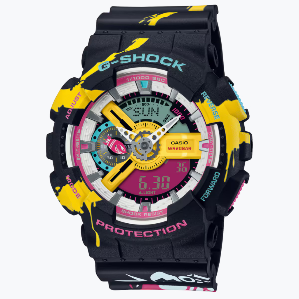 برای یک همکاری حماسی آماده شوید که G-SHOCK را با بازی آنلاین جهانی پرطرفدار، League of Legends همراه می کند. ما با GA-110 مقاوم شروع می کنیم و قهرمان محبوب و کاریزماتیک League of Legends، Jinx را مستقیماً وارد عمل می کنیم. قاب و بند که با رنگهای زنده چاپ شدهاند، ماوریک وحشی و سلاح مشخص او، موشک Super Megadeath را تداعی میکنند. این موتیف بازیگوش در عقربه کوچکی به شکل موشک جینکس روی صفحه ورودی در موقعیت ساعت 9 منعکس می شود.