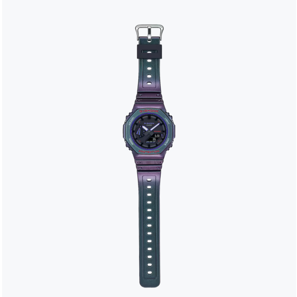برای کسانی که در دنیای مجازی هدف بالاتری دارند - و در زندگی واقعی! G-SHOCK را با الهام از عزم لازم برای رسیدن به بالاترین سطوح رایانه ای و بازی های بقا معرفی می کنیم. گیمرها می دانند که برای کسب امتیاز بالا در بازی های اکشن و تیراندازی چه چیزی لازم است. این ساعتها دنیای بازی هیجانانگیز و همیشه در حال تغییر را با رنگ پلاریزهای به رنگ بنفش و سبز بازسازی میکنند که بسته به زاویه دید تغییر رنگ میدهد. جزئیاتی مانند محدوده هدف برای تنظیم دید خود روی هدف، در لهجه های نارنجی و گرافیک صفحه نمایش LCD برای طراحی بازیگوشی که به طور یکپارچه بین دنیای واقعی و مجازی حرکت می کند، گنجانده شده است. مورد علاقه خود را انتخاب کنید - GA-2100AH هشت ضلعی، کلاسیک دیجیتال DW-B5600AH با بلوتوث، یا ترکیب دیجیتال-آنالوگ GA-B001AH در ساختاری خلاقانه، همچنین با بلوتوث.