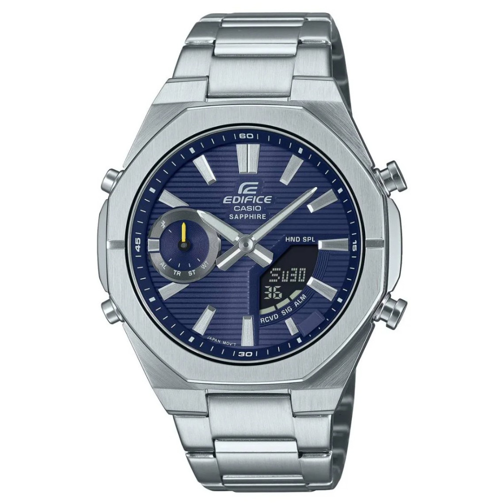 این ساعت از سری EDIFICE با هدف ساخت کرونوگرافهایی سبک، دقیق و خوشدست طراحی شده. قاب و بند استیل براق در کنار شیشهی مقاوم سافایر کریستال (Sapphire Crystal) باعث میشن ظاهر ساعت همیشه تمیز و شفاف بمونه و در برابر خط و خش مقاومت بالایی داشته باشه.
