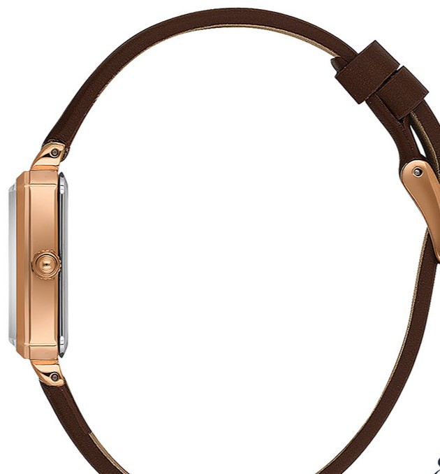 طراحی کلاسیک با قاب مستطیلی رزگلد، صفحه سرمهای و بند چرمی قهوهای