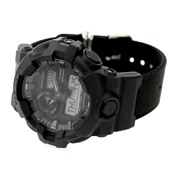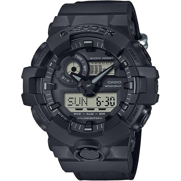 مدل GA‑700BCE‑1ADR بخشی از سری GA‑700 است که به طراحی قوی، ابعاد بزرگ و ترکیب نمایشگر آنالوگ-دیجیتال شناخته میشود. در این نسخه، رنگ غالب مشکی است و بند آن از جنس نایلون Cordura® Eco Fabric ساخته شده که هم مقاومت بالا دارد و هم سبکتر از بندهای کاملاً رزینی است.